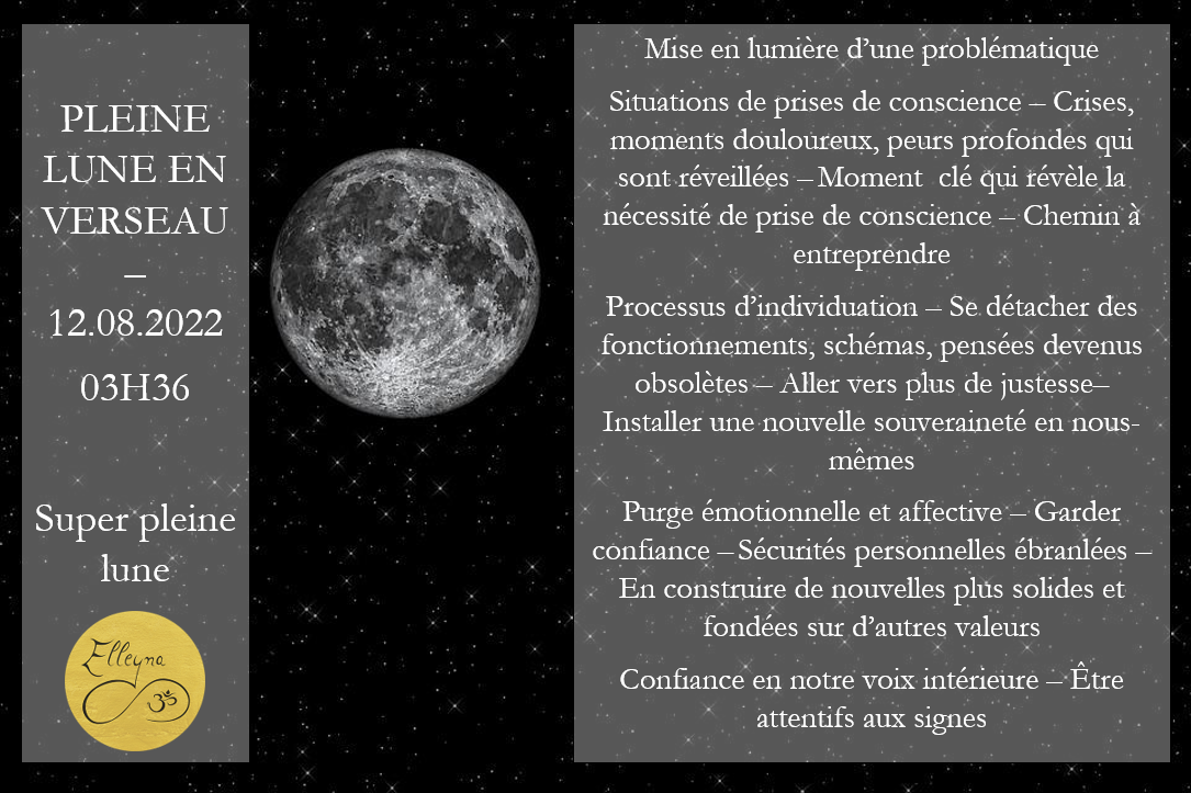 La pleine lune nous demande de revoir ce qui a fait sécurité jusque-là, qui n’est plus nécessaire, et donc d’aller vers d’autres ressources. Nous devons rompre avec d’anciennes sécurités devenues obsolètes pour aller chercher dans nos dons, nos compétences, nos ressources intérieures, une sécurité qui est fondée sur d’autres valeurs pour nous propulser vers un renouveau, vers plus d’autonomie, d’indépendances de souveraineté personnelles, de créativité (laissons-là s’exprimer), se libérer d’attachements, de contraintes pour laisser la vie nous traverser en acceptant ces aléas qui font partie de la vie qui est en mouvement permanent.