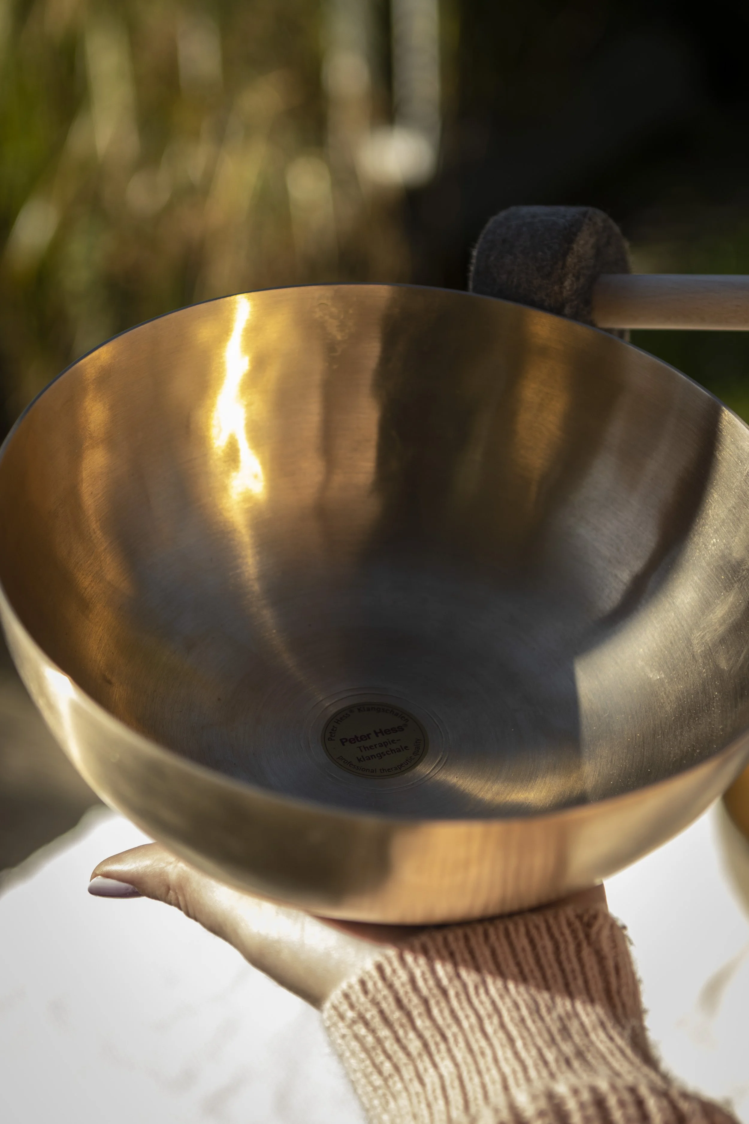 Un peu plus tard, j’ai suivi une formation en Massage Sonore aux bols chantants (appelé aussi Massage Sonore aux bols tibétains). Mes bols sont ceux de Peter Hess, ingénieur physicien et pédagogue allemand, fondateur de la Peter Hess Academy. Peter Hess avait remarqué l’influence des sons sur le corps, l’esprit et l’âme. Il a mis de nombreuses années à concevoir ces bols dont la qualité est reconnue sous le label Bols pour Massage Sonore – Peter Hess®. Ma pratique est celle qui m’a été enseignée par Barbara et Juan qui ont développé leurs propres protocoles après avoir suivi la formation Thérapie par le Son et utilisation des Gongs en méditation et concert à la filiale en Pologne de l'Institut Allemand