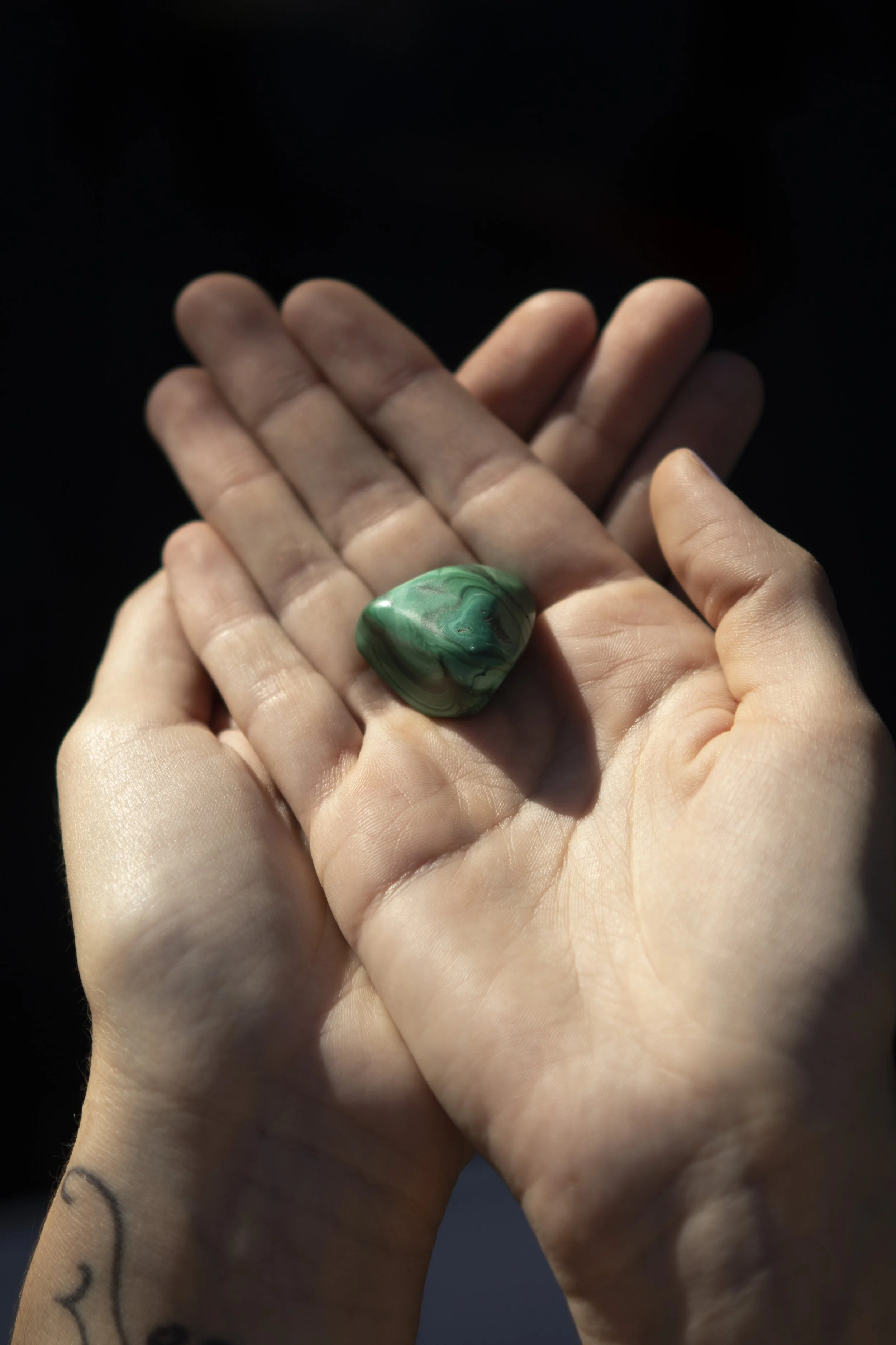 La malachite porte les vibrations du cœur, ses nuances de verts représentent les leçons que le cœur doit traverser au cours de sa vie.