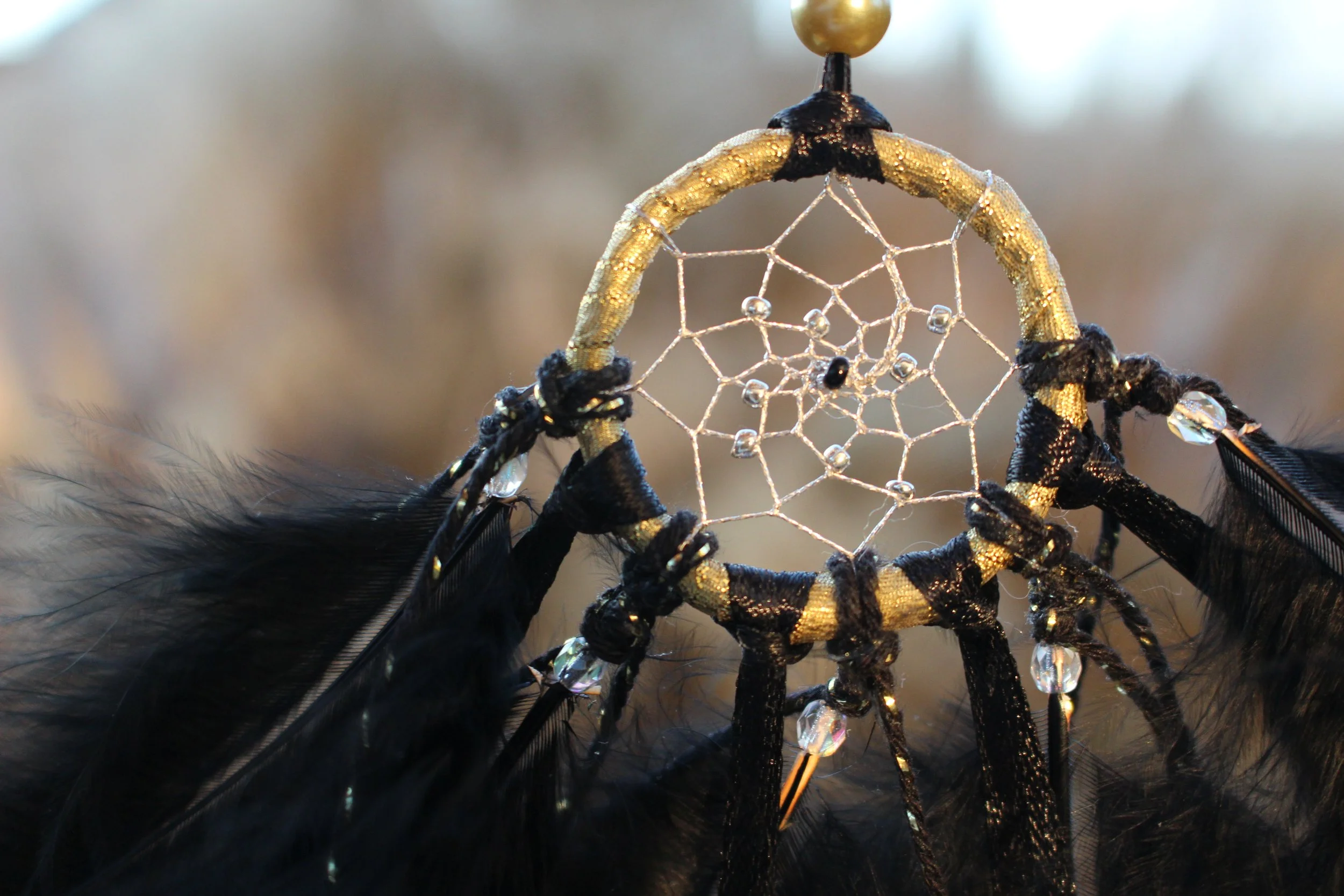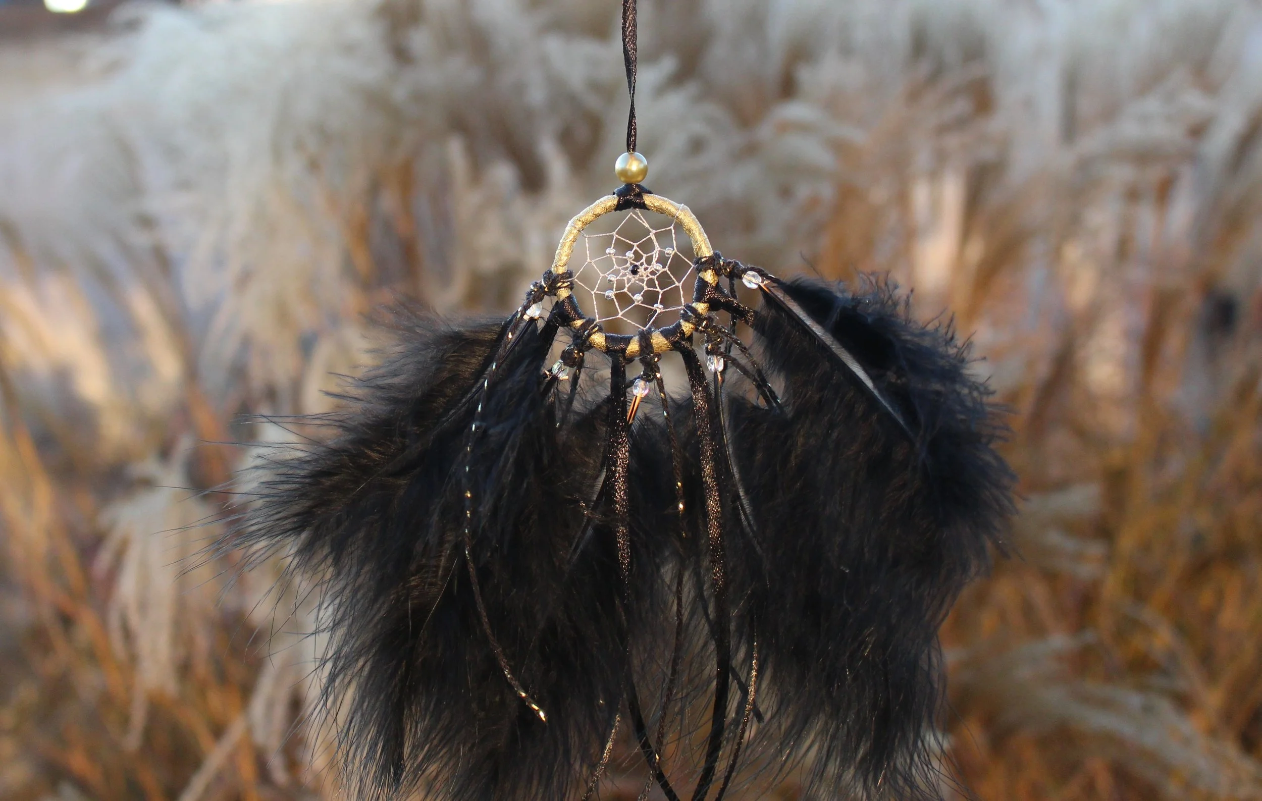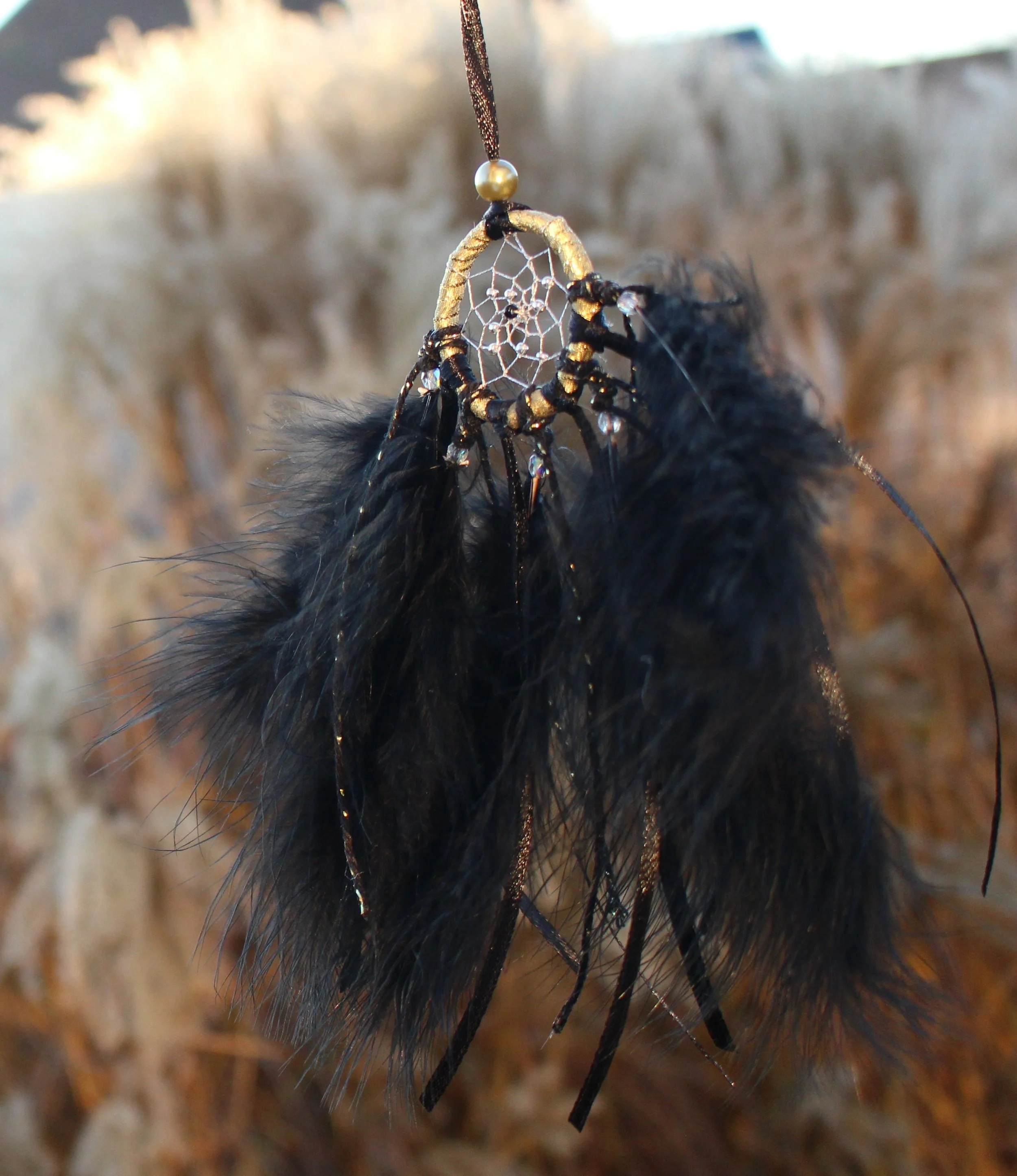 Attrape-rêves mini noir et doré - Réf. 2022064 cm de diamètre - Rubans doré - Rubans de satin noir - Plumes noires - Perles de qualité16,00 € Acheter/Commander